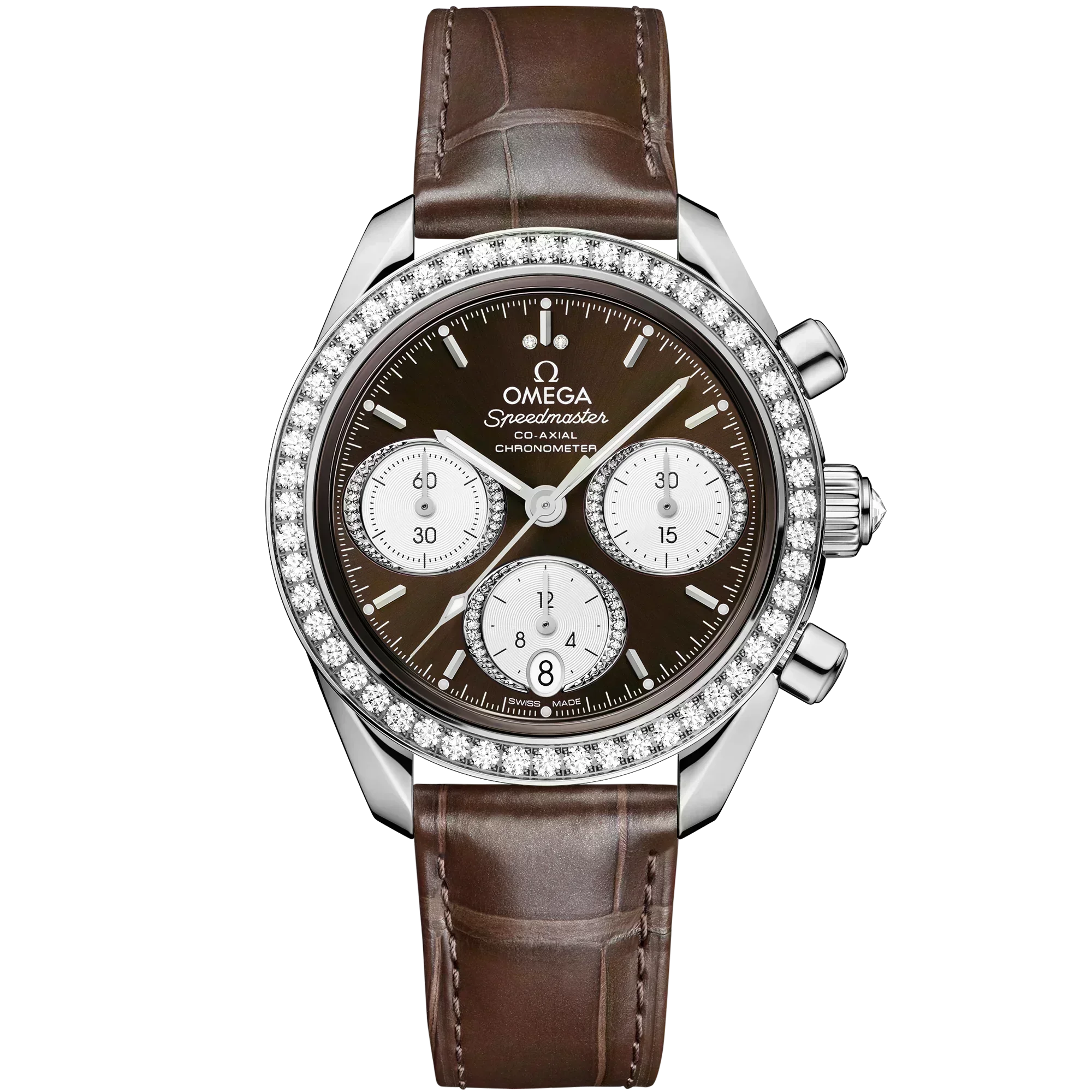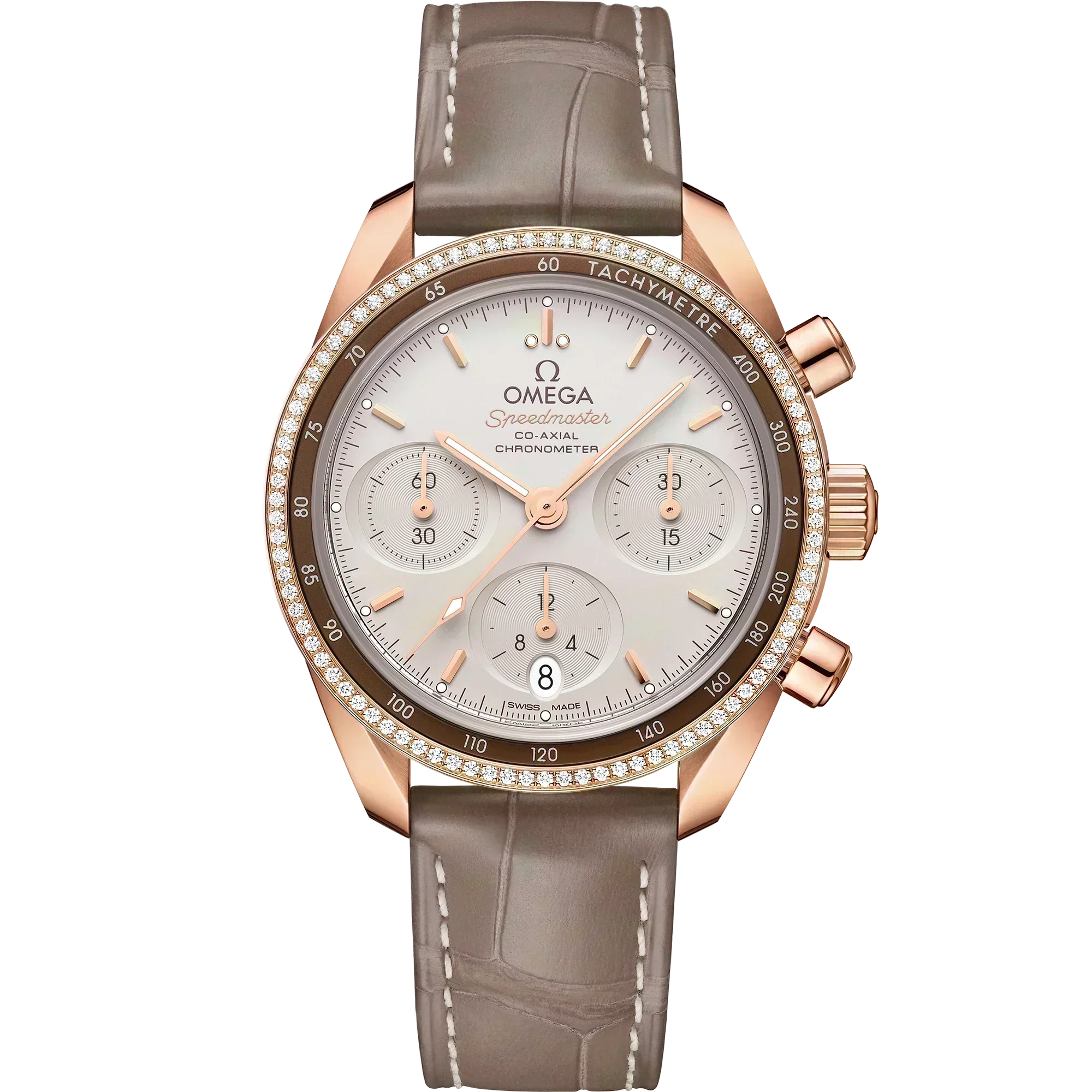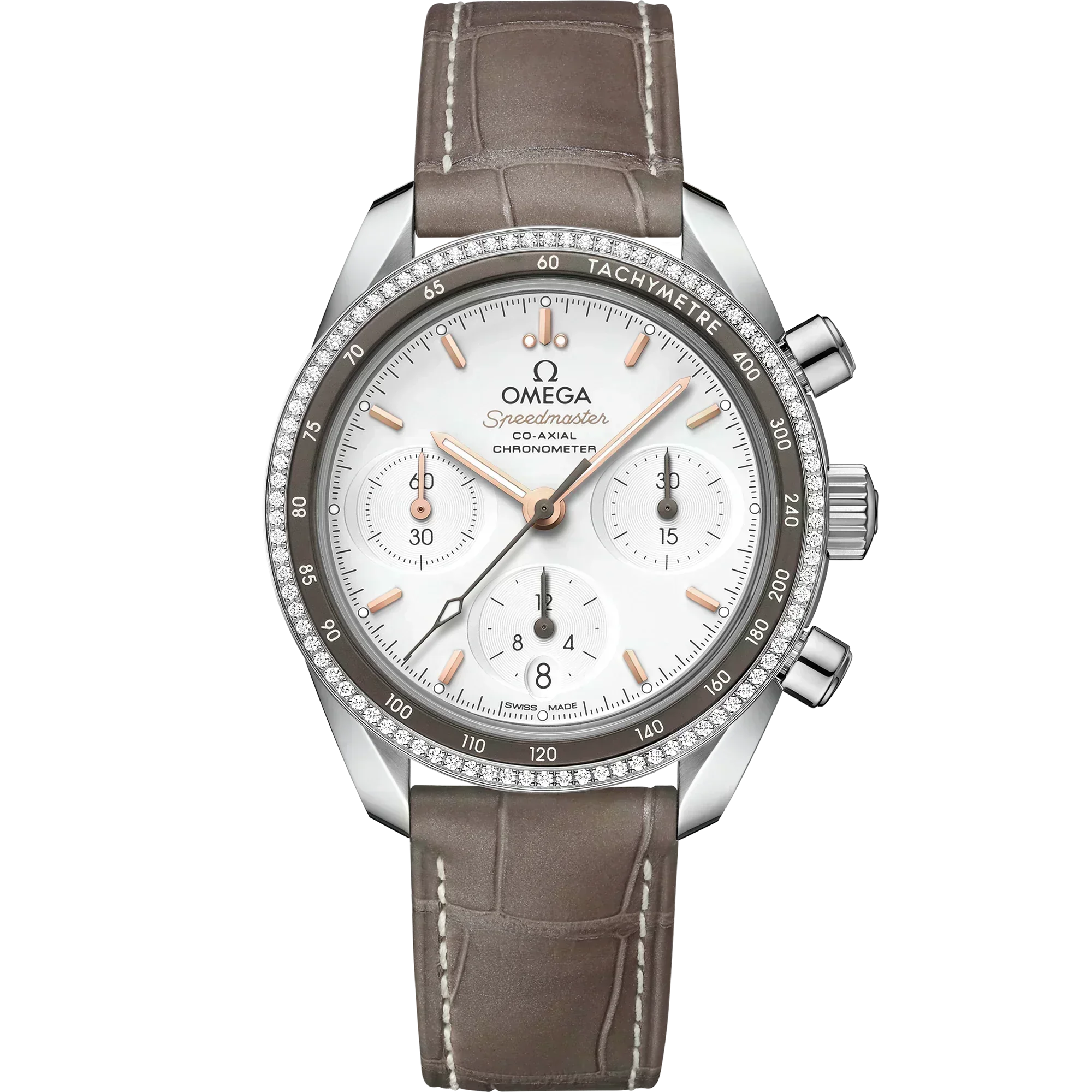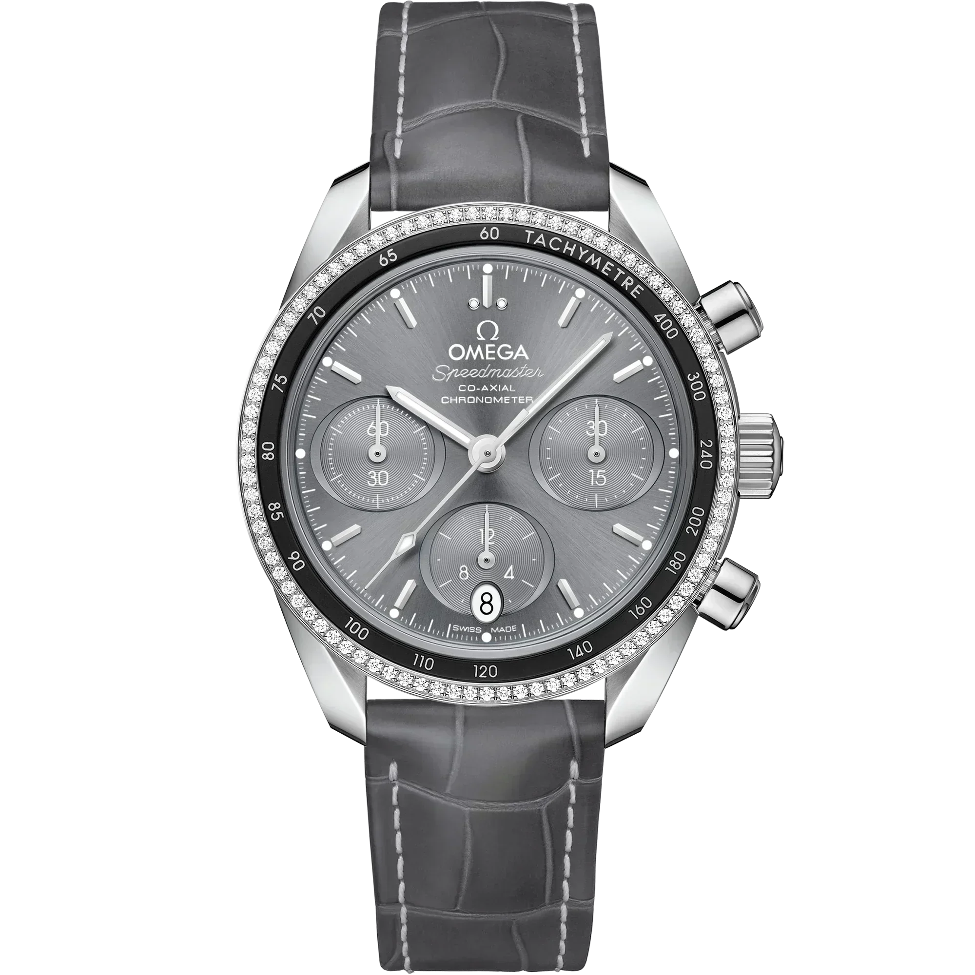 The Speedmaster 38 mm collection has been crafted with simplicitysize and colour in mindyet still retains the look and heritage of OMEGA’s most famous chronograph. This model features a stainless steel case with a dual bezel design. The inner section of the bezel features a tachymeter scale on a black aluminium ring while the outside is diamond-paved. The sun-brushed grey dial includes horizontal oval subdials and a vertical oval date window at 6 o’clock. The hands and indexes are rhodium-plated. The watch has a grey leather strapa Seahorse medallion on the casebackand is driven by the OMEGA Co-Axial Calibre 3330.