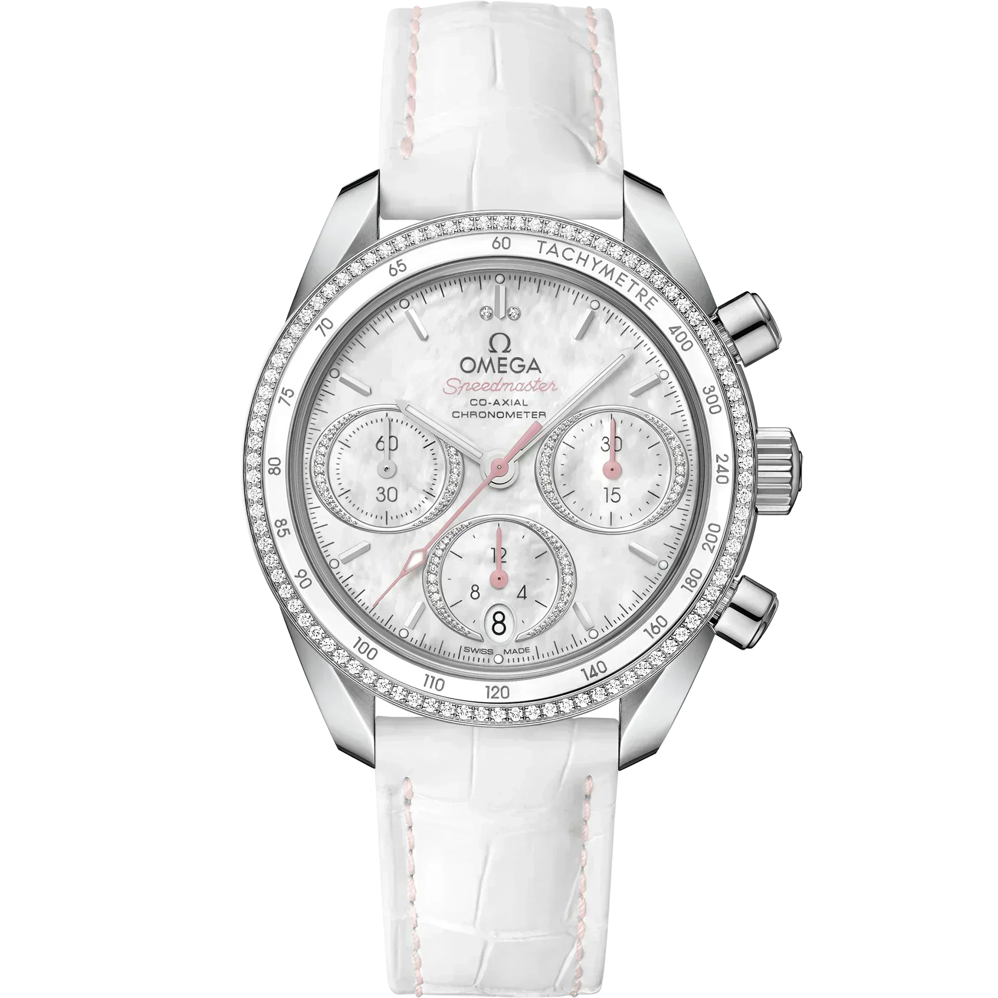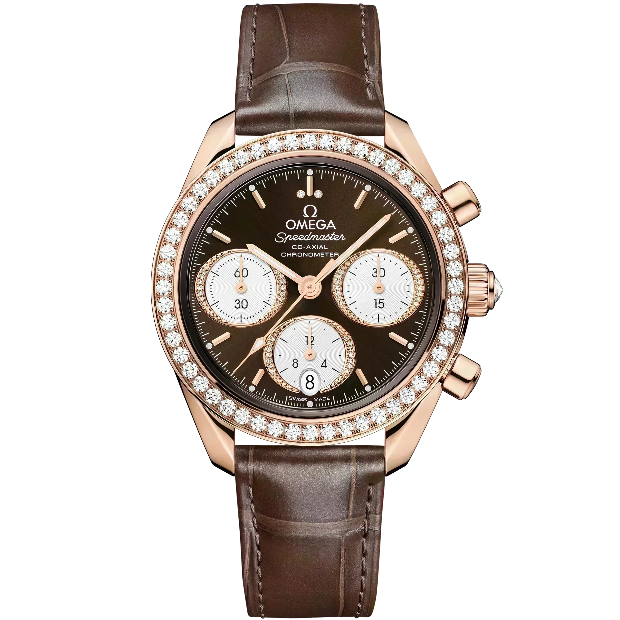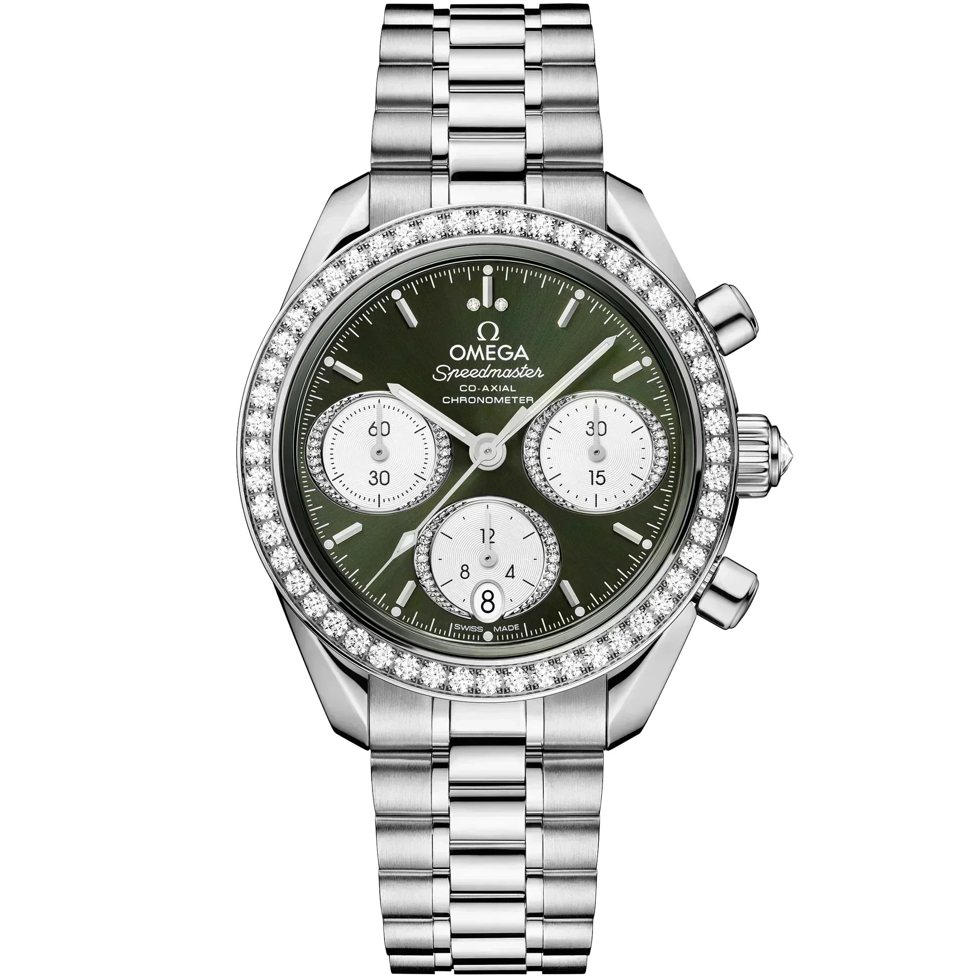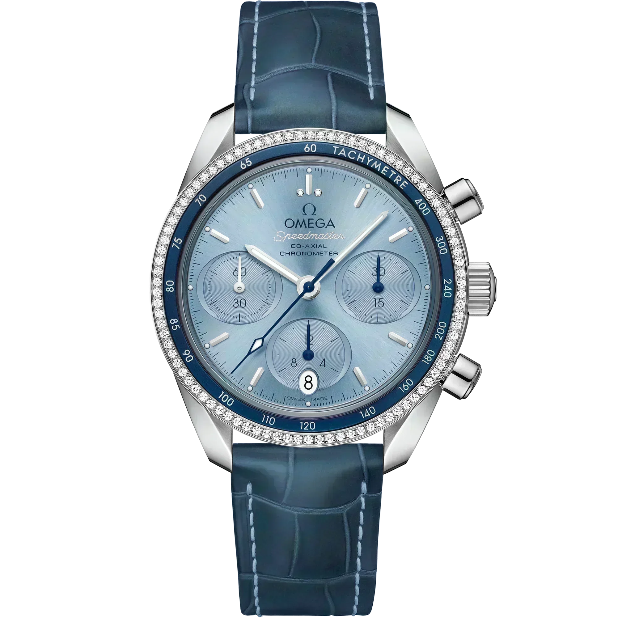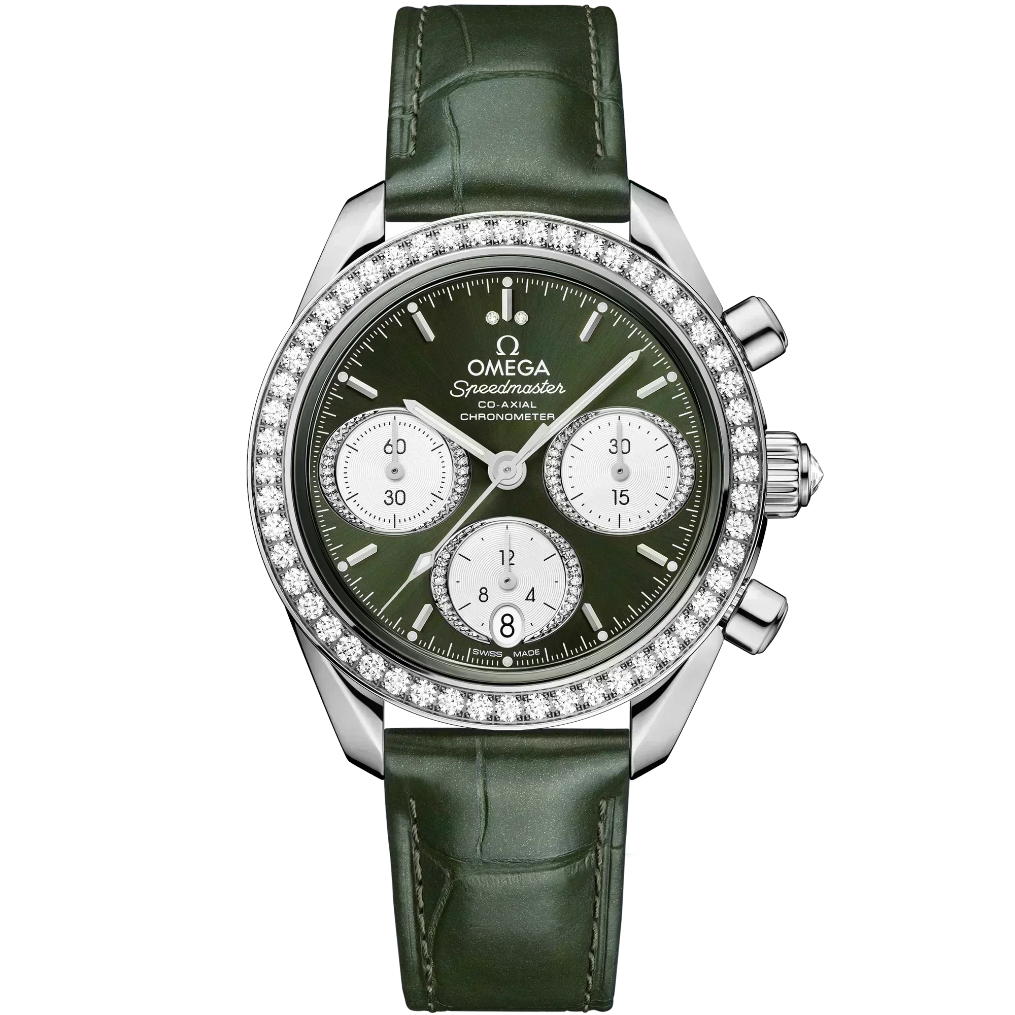 The Speedmaster 38 mm collection has been crafted with simplicitysize and colour in mindyet still retains the look and heritage of OMEGA’s most famous chronograph. This model features a stainless steel case with a dual bezel design. The inner section of the bezel features a tachymeter scale on a black aluminium ring while the outside is diamond-paved. The sun-brushed grey dial includes horizontal oval subdials and a vertical oval date window at 6 o’clock. The hands and indexes are rhodium-plated. The watch has a grey leather strapa Seahorse medallion on the casebackand is driven by the OMEGA Co-Axial Calibre 3330.