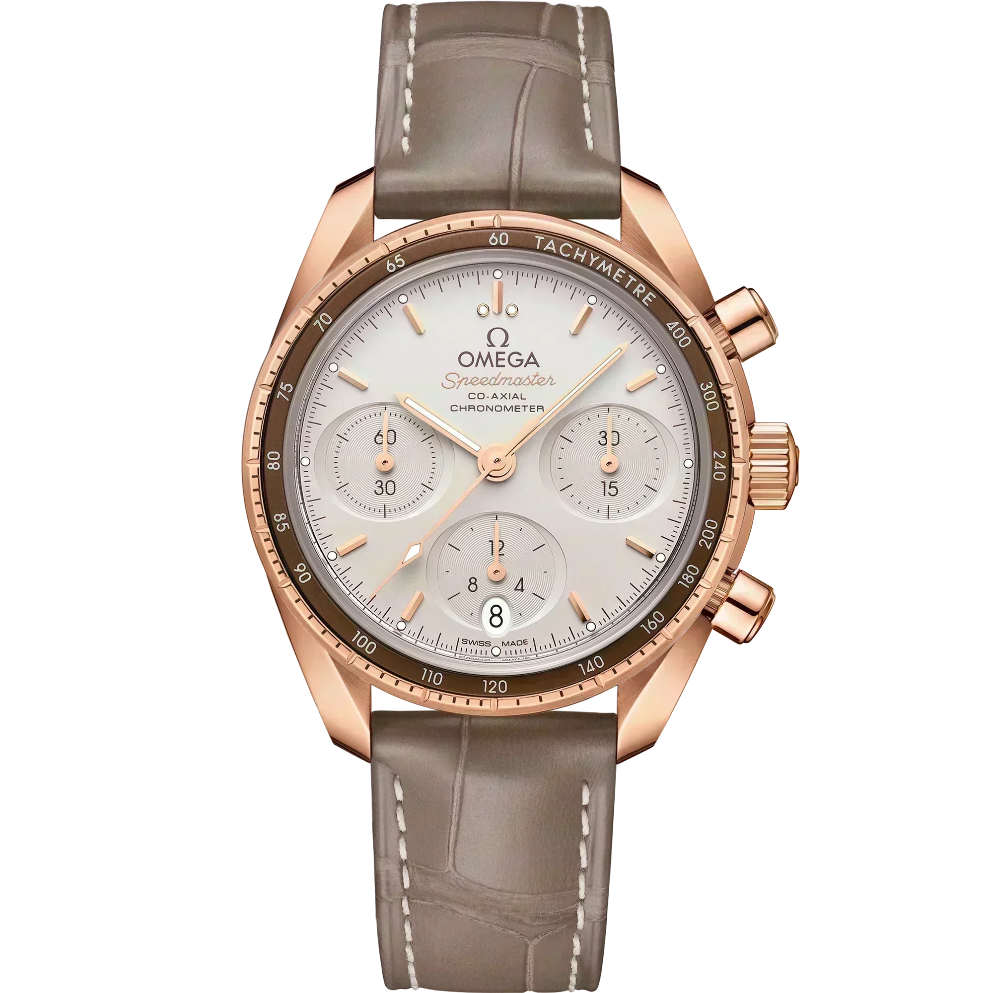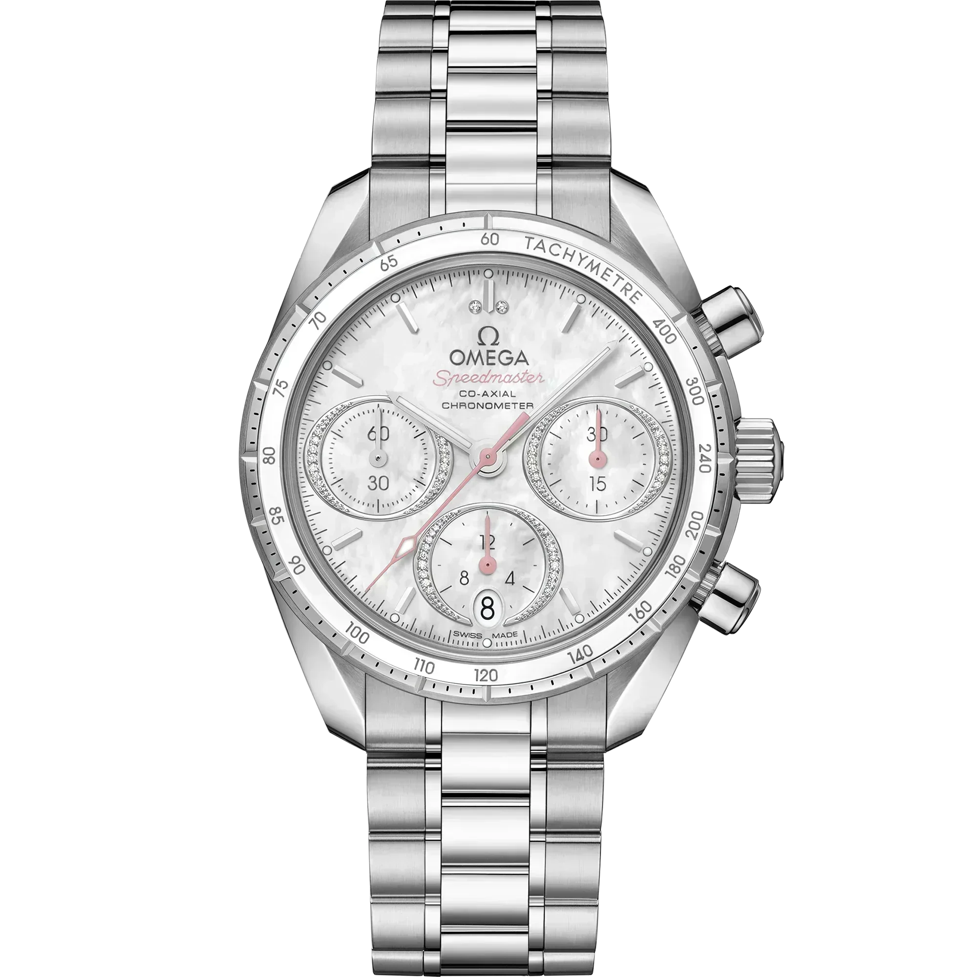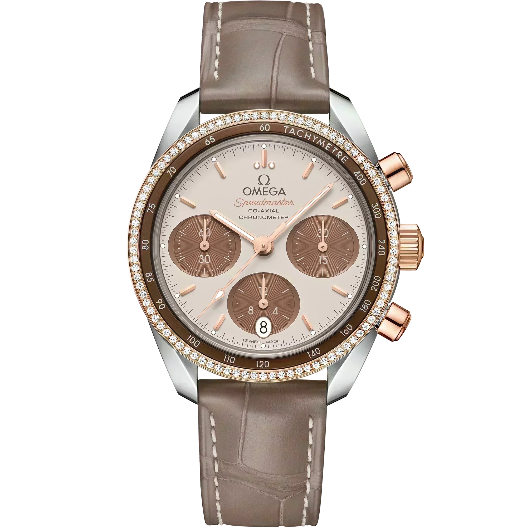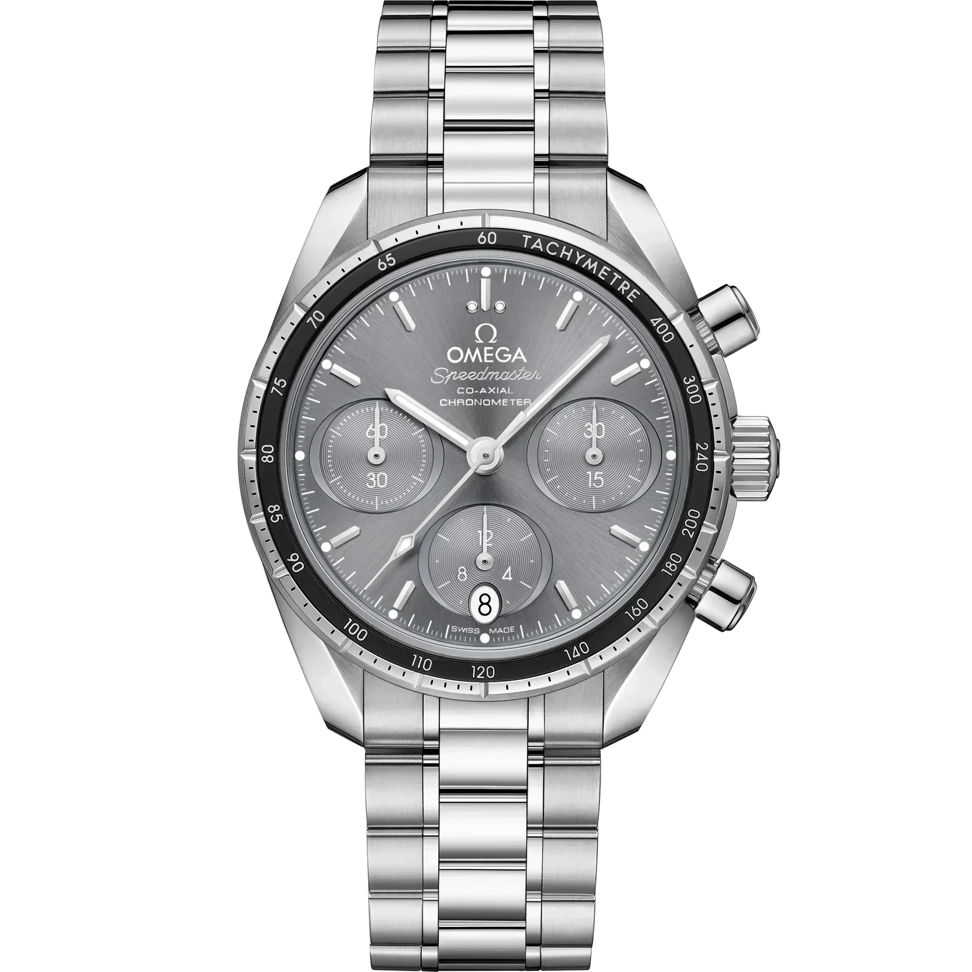 The Speedmaster 38 mm collection has been crafted with simplicitysize and colour in mindyet still retains the look and heritage of OMEGA’s most famous chronograph. This model features a stainless steel case with a dual bezel design. The inner section of the bezel features a tachymeter scale on a black aluminium ring while the outside is diamond-paved. The sun-brushed grey dial includes horizontal oval subdials and a vertical oval date window at 6 o’clock. The hands and indexes are rhodium-plated. The watch has a grey leather strapa Seahorse medallion on the casebackand is driven by the OMEGA Co-Axial Calibre 3330.