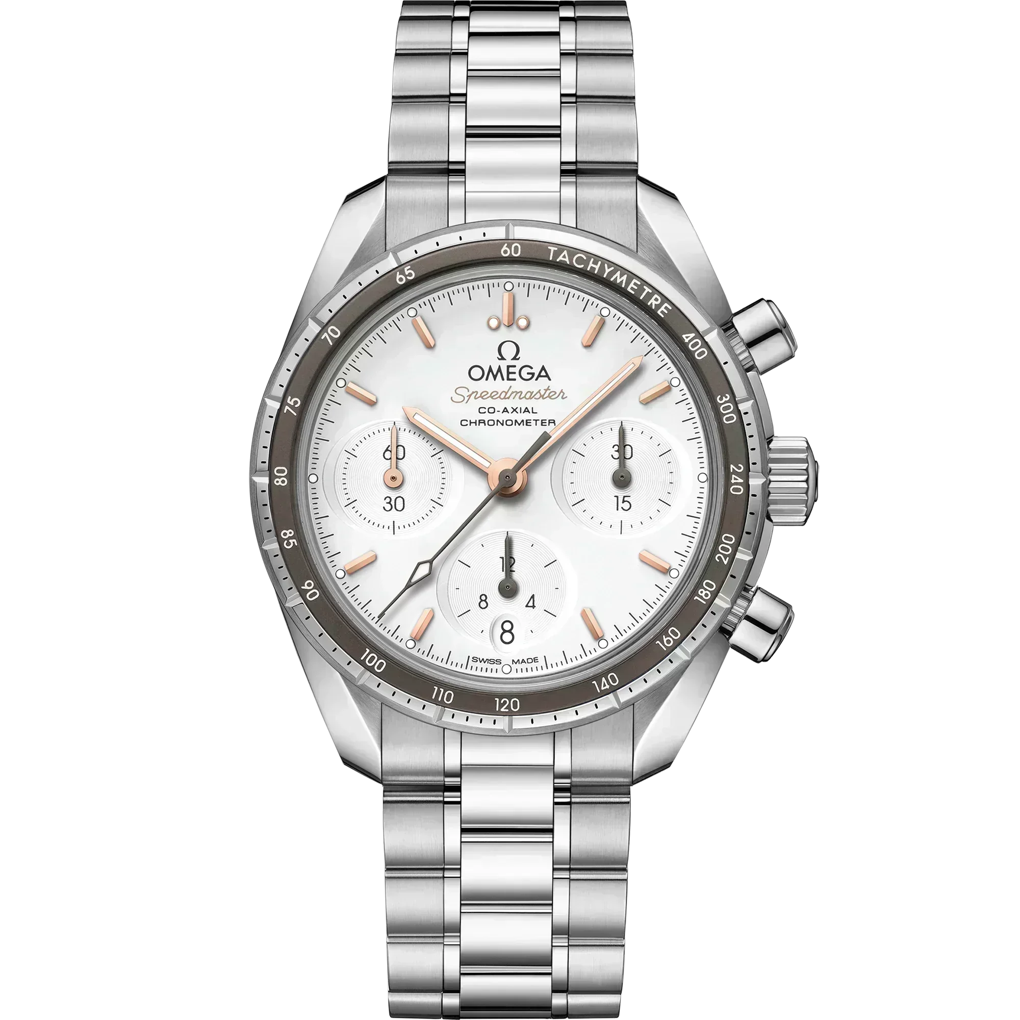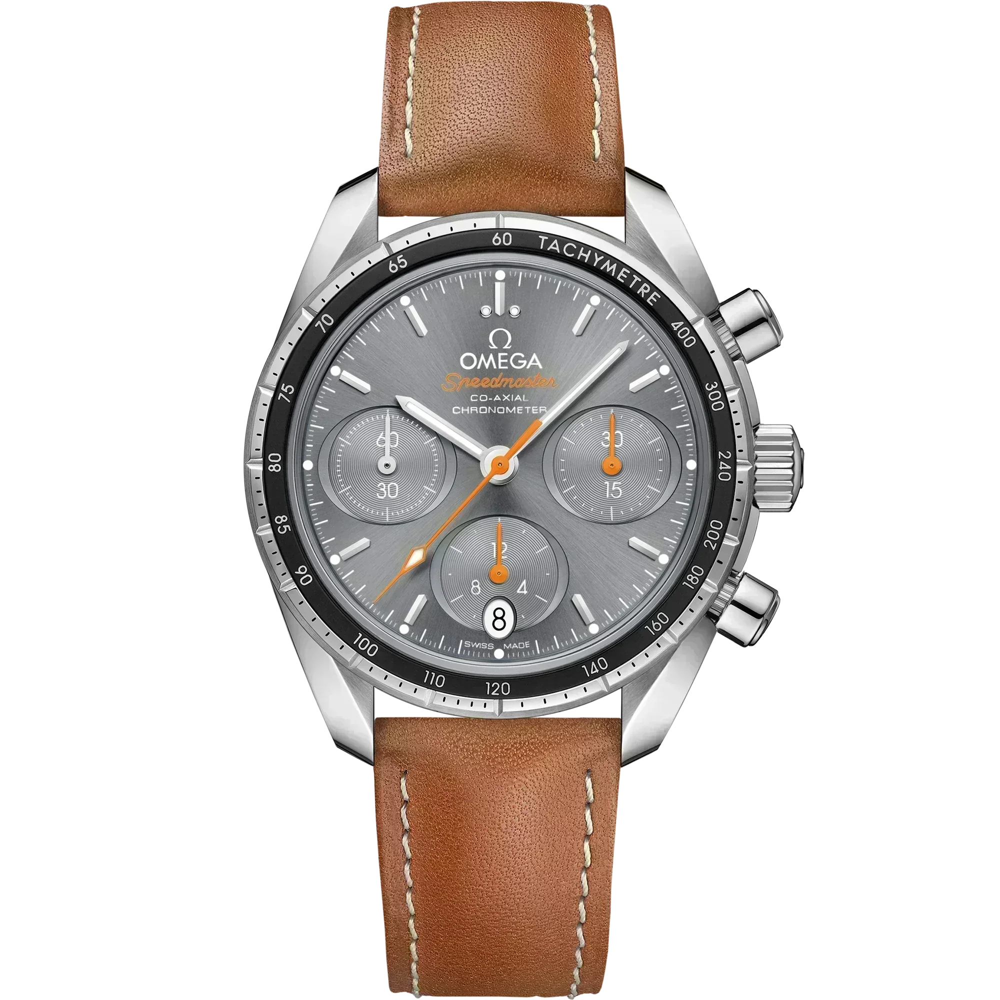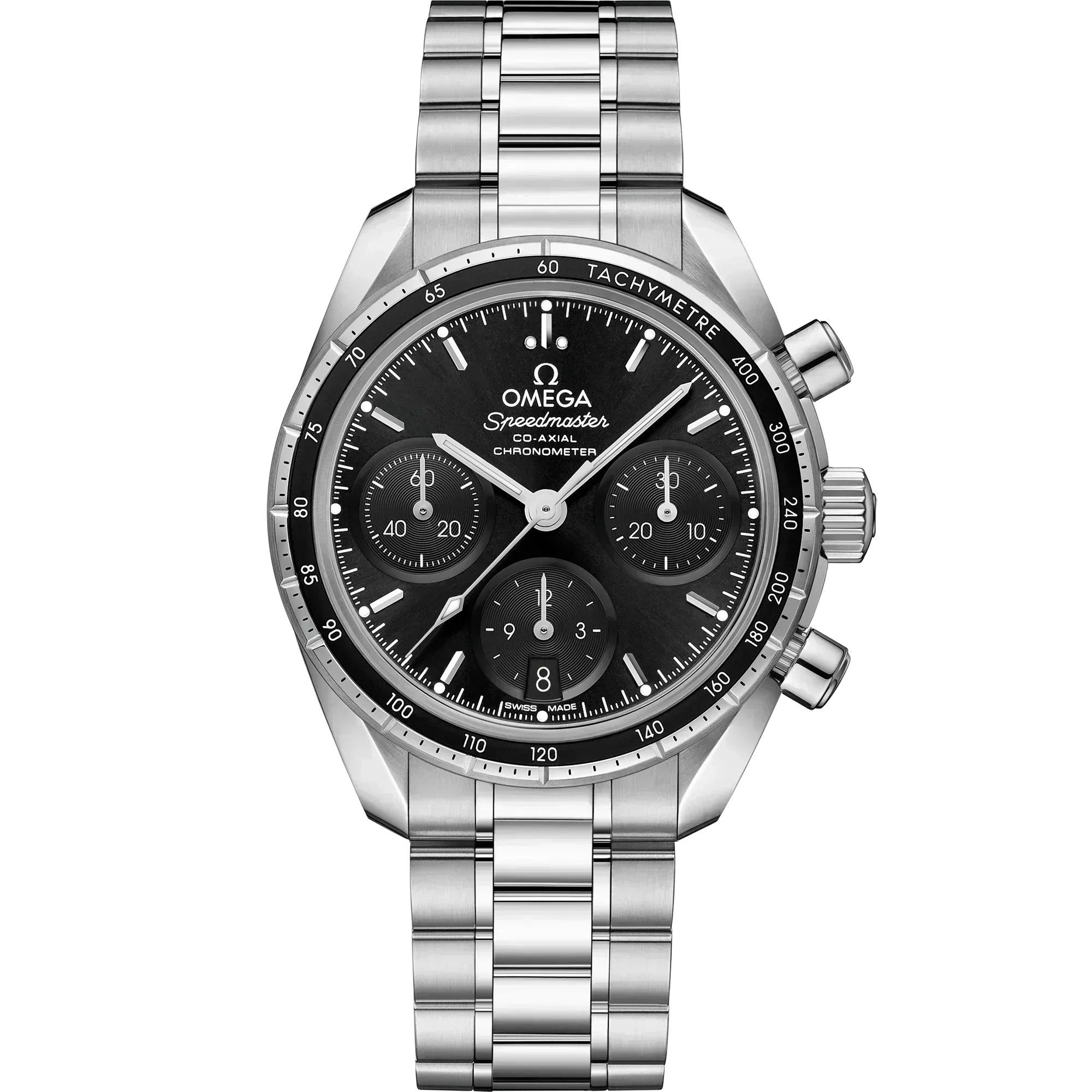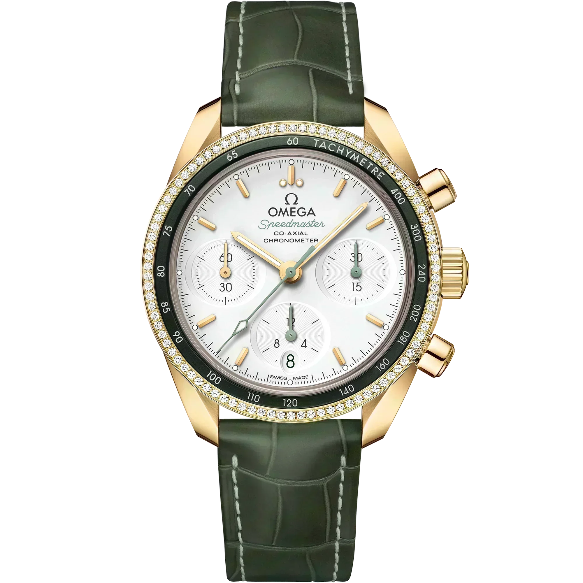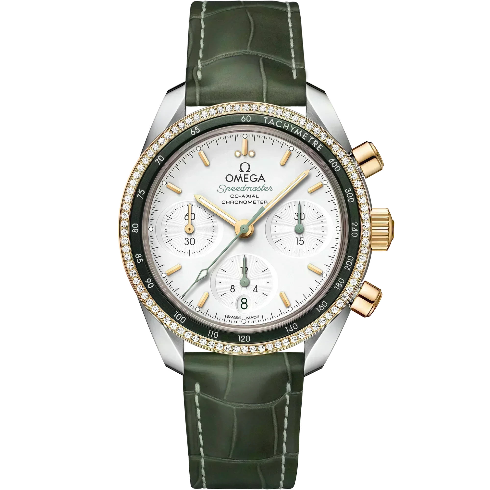 The Speedmaster 38 mm collection has been crafted with simplicitysize and colour in mindyet still retains the look and heritage of OMEGA’s most famous chronograph. This model features a stainless steel case with a dual bezel design. The inner section of the bezel features a tachymeter scale on a black aluminium ring while the outside is diamond-paved. The sun-brushed grey dial includes horizontal oval subdials and a vertical oval date window at 6 o’clock. The hands and indexes are rhodium-plated. The watch has a grey leather strapa Seahorse medallion on the casebackand is driven by the OMEGA Co-Axial Calibre 3330.