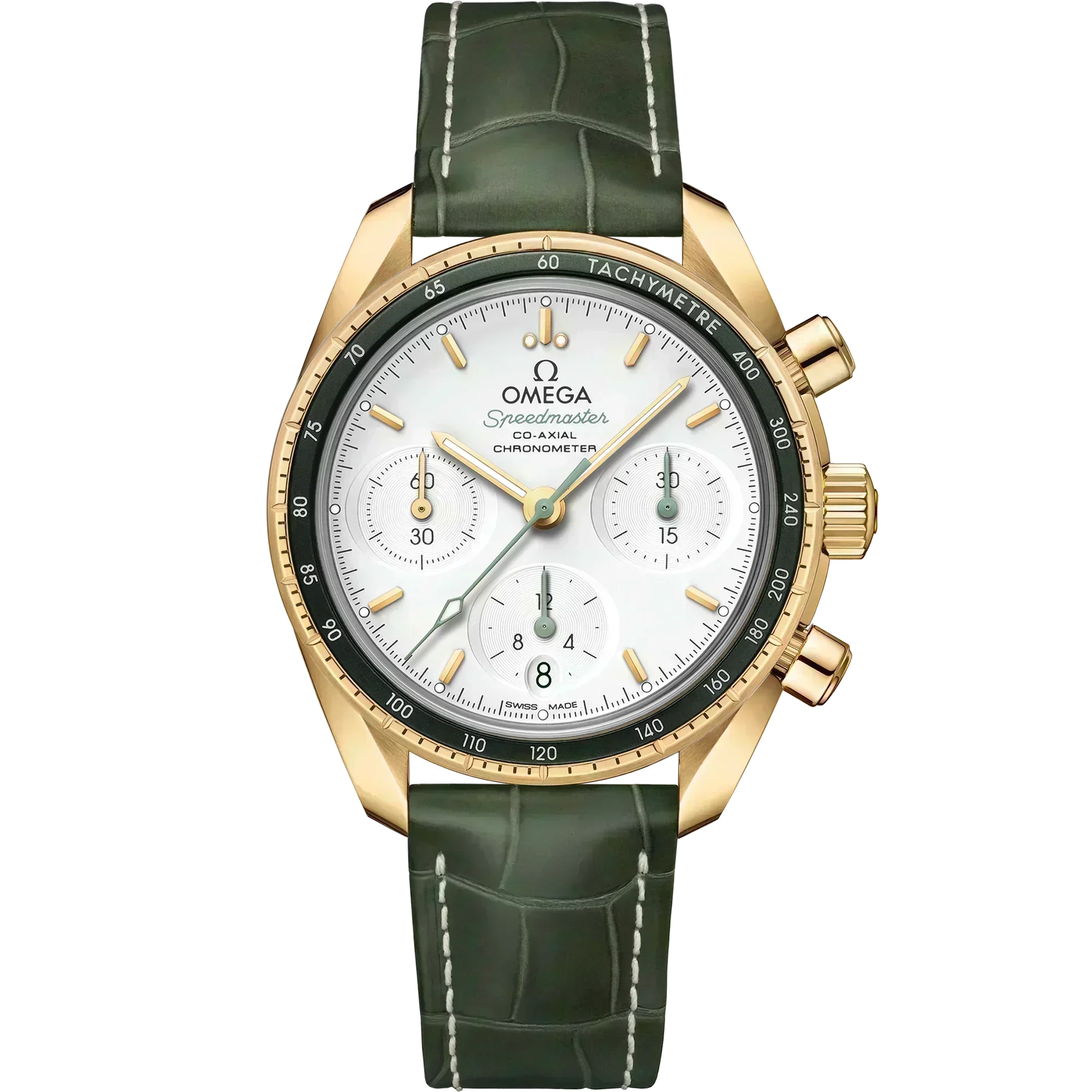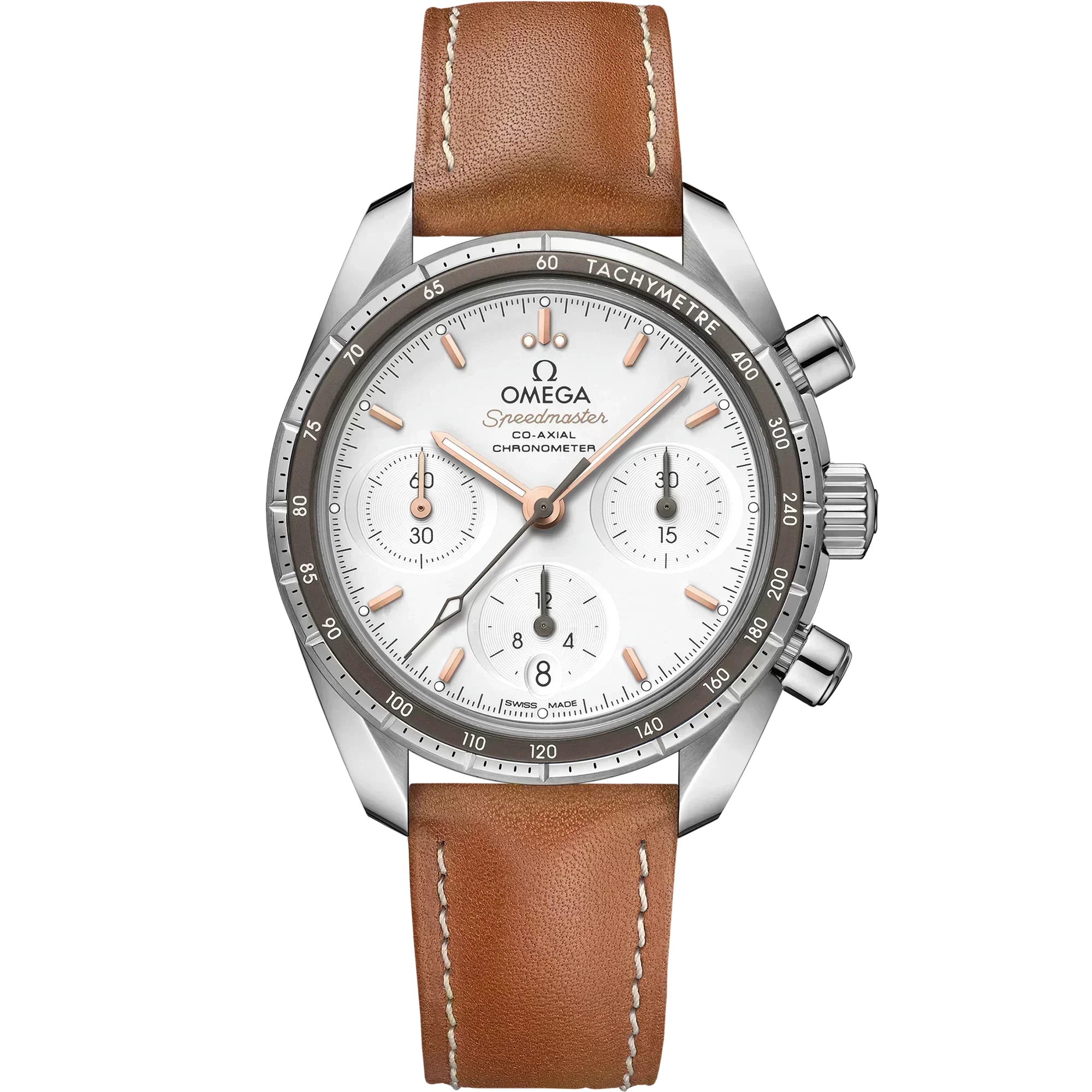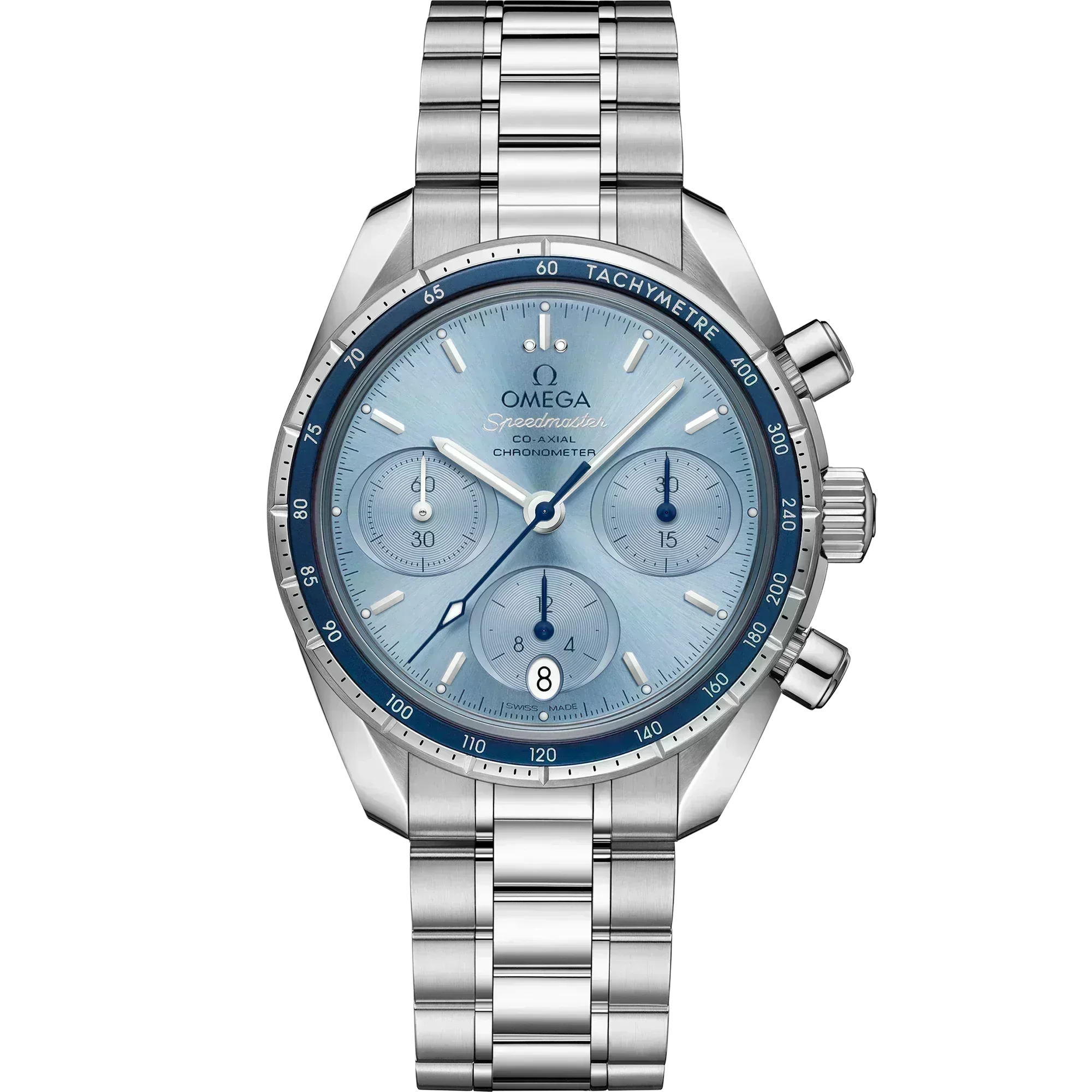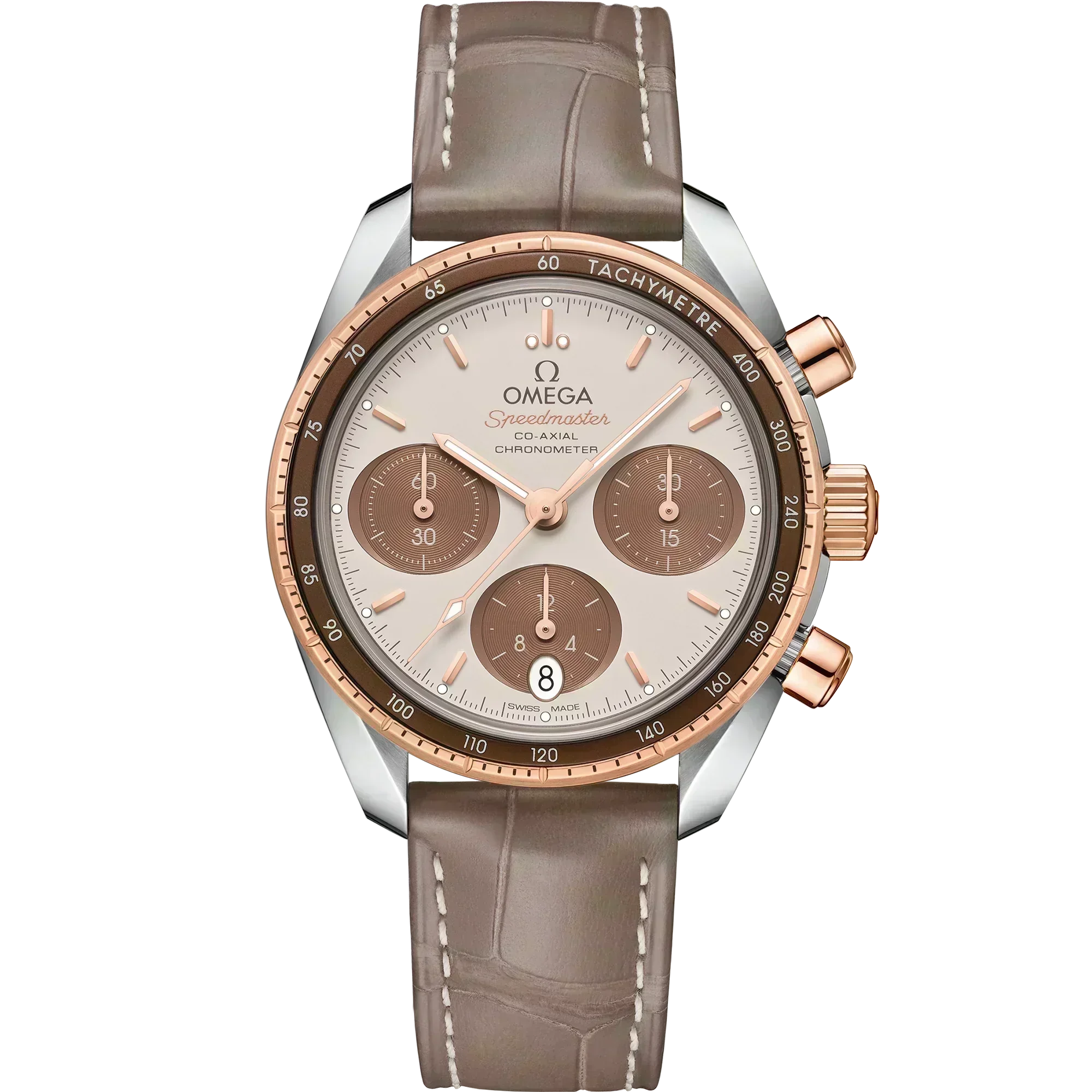 The Speedmaster 38 mm collection has been crafted with simplicitysize and colour in mindyet still retains the look and heritage of OMEGA’s most famous chronograph. This model features a stainless steel case with a dual bezel design. The inner section of the bezel features a tachymeter scale on a black aluminium ring while the outside is diamond-paved. The sun-brushed grey dial includes horizontal oval subdials and a vertical oval date window at 6 o’clock. The hands and indexes are rhodium-plated. The watch has a grey leather strapa Seahorse medallion on the casebackand is driven by the OMEGA Co-Axial Calibre 3330.
